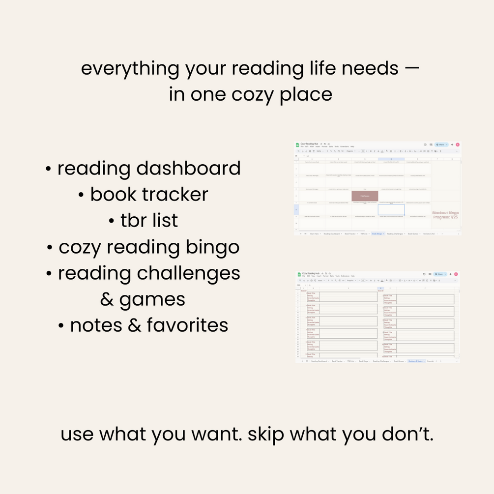 The Cozy Reading Hub is a warm, easy-to-use Google spreadsheet made for book lovers who want to track their reading, play fun book games, and stay excited about reading again.